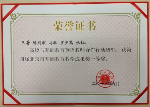 王蔷教授及其团队荣获第四届北京市基础教育教学成果奖一等奖