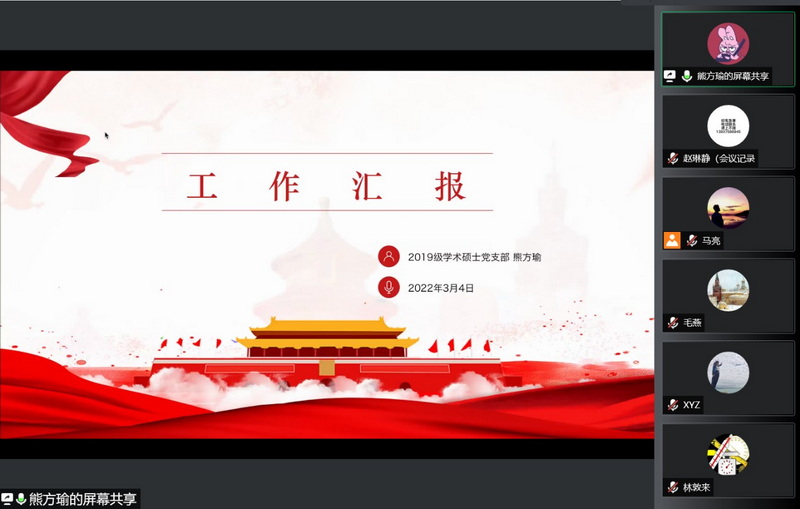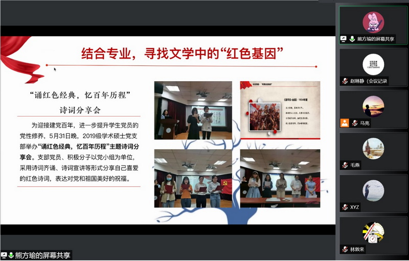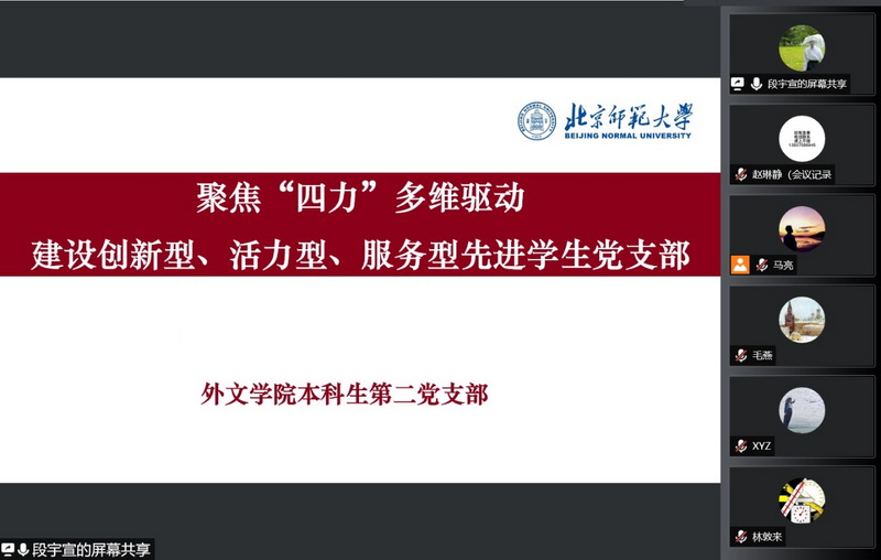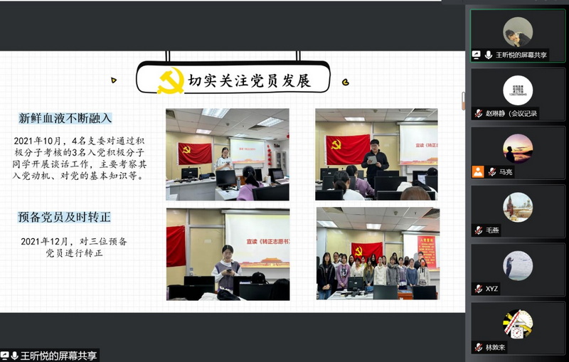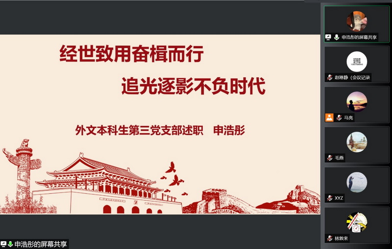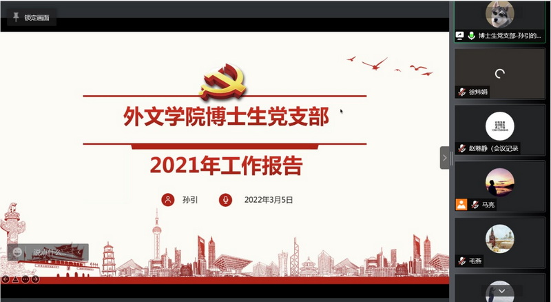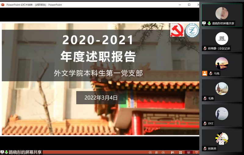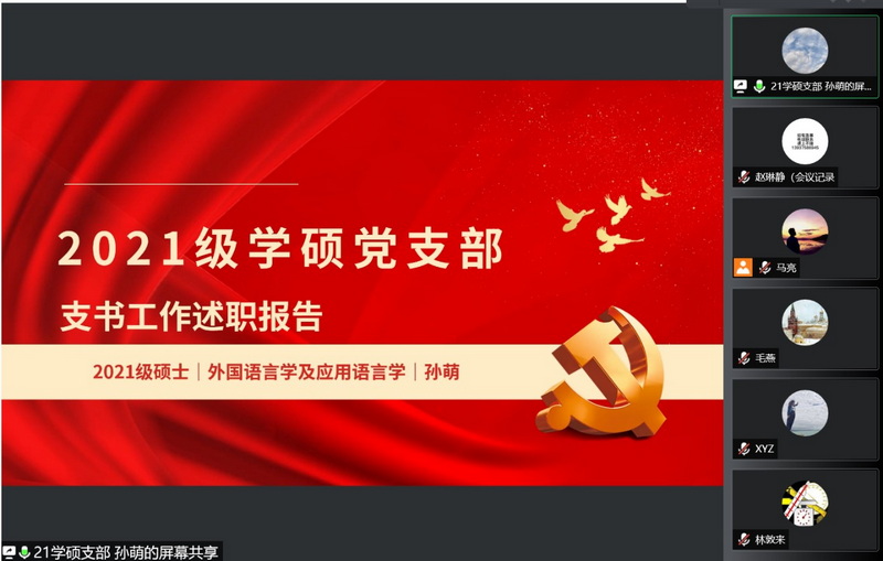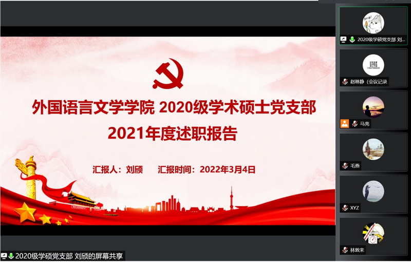 2022年3月4日下午,外文学院党委于线上举办2021年度台湾色情 学生党支部书记述职考评会。会议由外文学院党委副书记张新颖老师主持,学院党委书记艾忻老师、党委组织委员林敦来老师、团委书记毛燕老师、双肩挑辅导员马亮老师,以及9名学生党支部书记参加了本次会议。