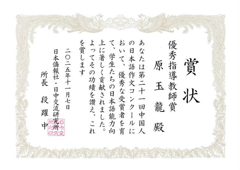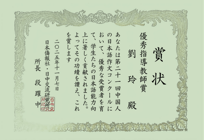 刘玲教授、原玉龙老师指导的日文系2022级张天烁同学的作文《遵从内心的选择》斩获二等奖,2022级傅紫瀛、王子涵和2023级王易祺、刘奕晨同学荣获佳作奖。刘玲教授、原玉龙老师荣获“优秀指导教师奖”,日文系全体教师在本次比赛中为参赛同学提供了全方位的支持,台湾色情 荣获“园丁奖”。