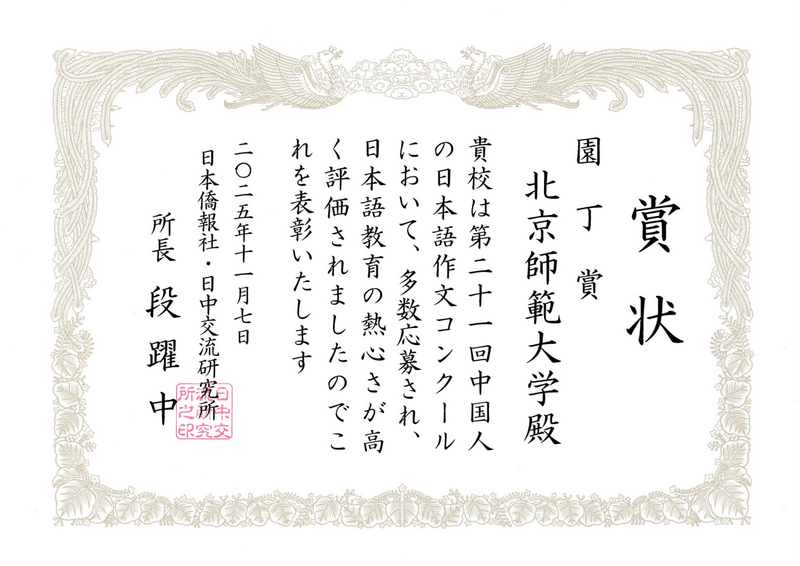 11月7日,第21届“中国人日语作文大赛”颁奖典礼在北京日本驻华大使馆隆重举行。日本国驻中华人民共和国特命全权大使金杉宪治、日本国驻华大使馆新闻文化中心一等秘书大村祐大、日本侨报出版社总编辑段跃中先生等嘉宾,以及获奖学生和指导教师出席了颁奖典礼。数十家中、日媒体现场报道,并进行网络直播。