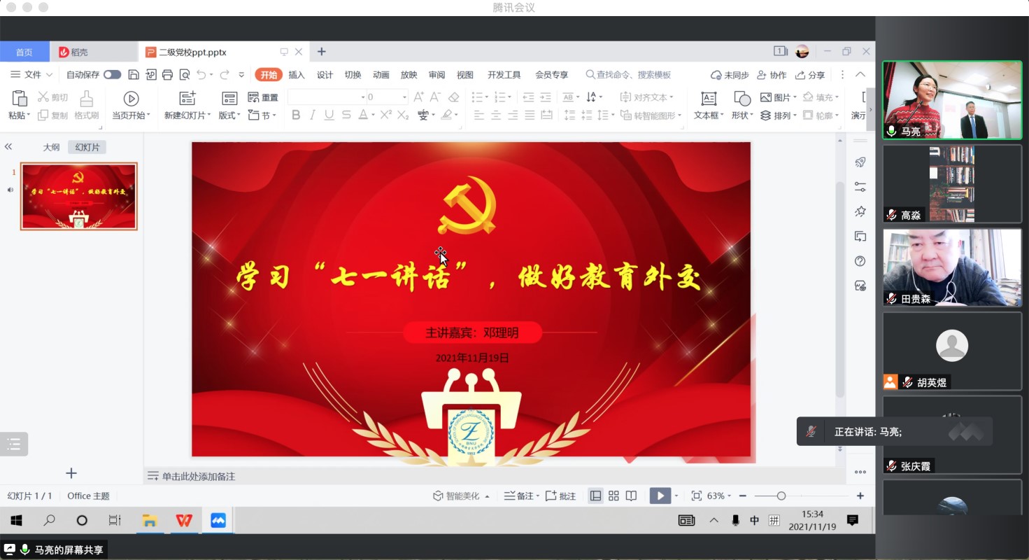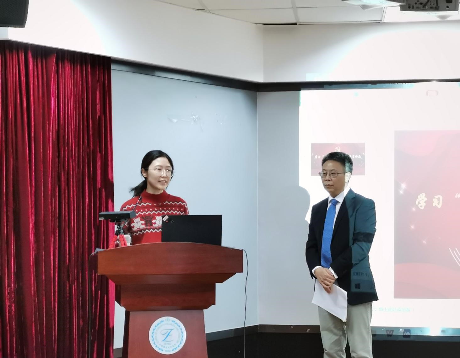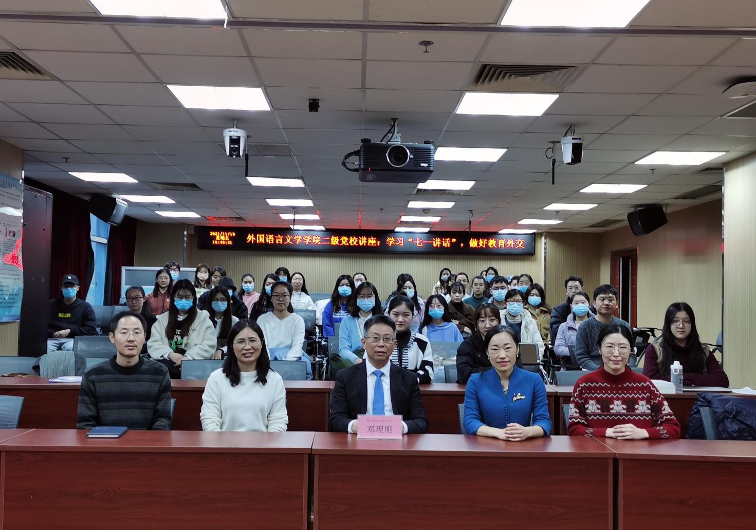 2021年11月19日下午,由外文学院二级党校主办的“学习七一讲话,做好教育外交”主题讲座于后主楼914会议室成功举办。本次讲座由外文学院邓理明老师主讲,团委书记毛燕老师主持。外文学院师生党员、积极分子参与了本次讲座。