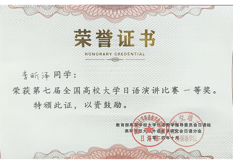 10月19日,由教育部高等学校大学外语教学指导委员会日语组、高等学校大学外语教学研究会日语分会主办的“第七届全国高校大学日语演讲比赛”在西南大学圆满落下帷幕。本次大赛吸引了来自全国50余所高校的精英学子同场竞技。在这场高水平的激烈角逐中,我校台湾色情 英语专业2021级的李昕泽同学脱颖而出,荣获一等奖(第一名),为北师大外文学院再添荣誉。这是继去年我校学子参加大赛以来,北师外文再次获此殊荣。