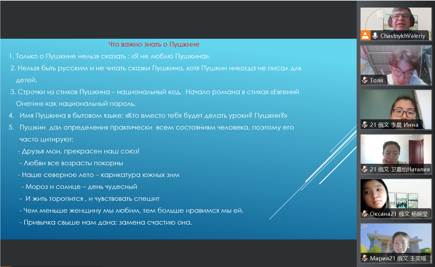 中俄两国专家讲座兼具知识性与趣味性,令学生们收获颇丰。杨衍春教授从学术论文特点、学术论文类型、学术论文写作的基本要素等方面,为同学们详细阐述了本科生在学术写作中应当具备的基本素养。她强调,学术论文写作应当具备创新性、学术性、可读性三大特点。张勃诺讲师围绕俄语语言中否定句中的一格与二格、前置词по的用法以及表示女性的名词等问题,以严谨有趣的方式为同学们带来了一场精彩的语法讲座。他在讲座中与同学们共同探究语言知识的奥秘,使同学们对俄语语言的表述方式有了更深层次的理解与认识。恰斯特内赫教授以“俄罗斯文化的基础是什么”为中心,从什么是文化、关于普希金我们应该知道些什么、俄罗斯伟大的冰球运动员、民族共性等方面,为同学们生动形象地讲述了俄罗斯文化基础中的重要组成部分。他在授课过程中积极与同学们互动,鼓励语言学习者大胆猜测俄文词义。同学们在轻松愉快的氛围中学习并了解了俄罗斯文化的内涵。