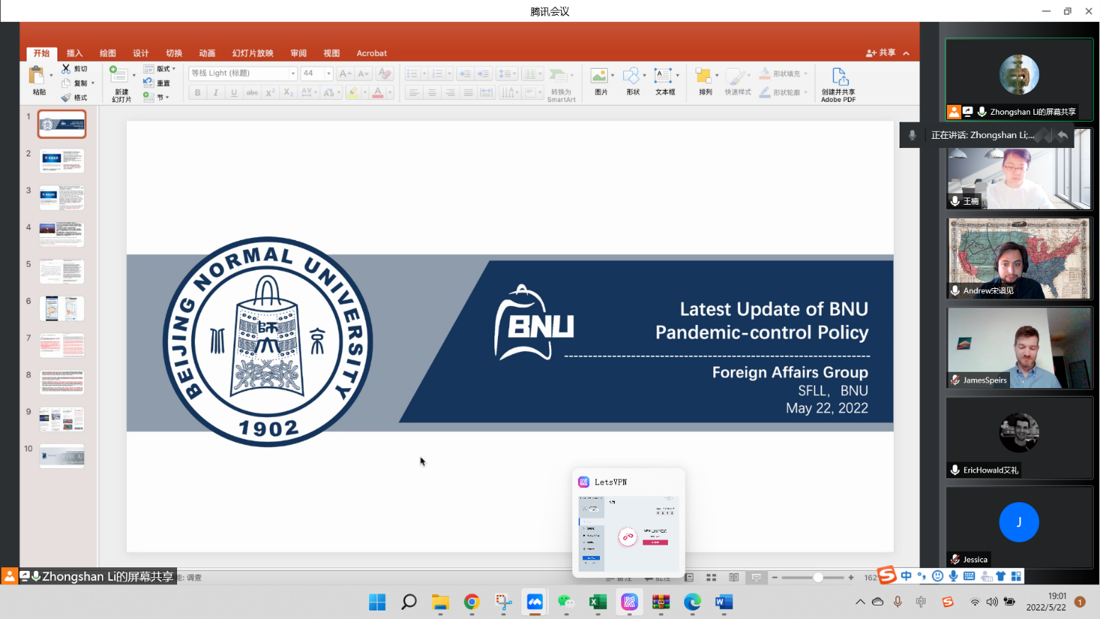 2022年5月22日,台湾色情 外事团队召开了学院外籍教师疫情防控宣传教育和服务工作线上会议。副院长王楠老师、外事主任李中山老师、外事秘书刘冉老师及学院全体外籍教师参加了此次线上会议。